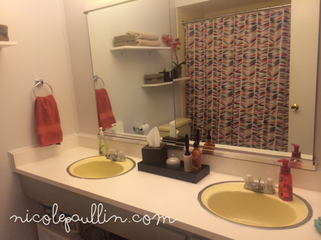 My bathroom is ugly. Like really, really, REALLY ugly. (insert piece about starving children in Africa without clean water here). In my western world, and selfish need to be “showy,” I was pinter-come. That’s a mix between pinterest inspired and overcome. So I took this and threw up pretty over it. It had this yucky...